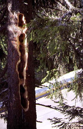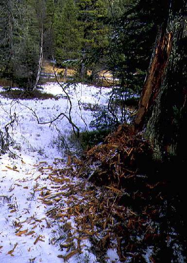 L'autre, très spectaculaire, sur les arbres sous forme de trous énormes et au sol sous forme de copeaux de plusieurs centimètres marque la présence du pic noir, le plus grand pic d'Europe.