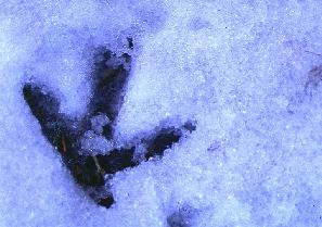 L'une au sol, tout à fait caractéristique, comprenant à l'avant trois doigts en éventail et à l'arrière un doigt plus court en diagonale à l'arrière révèle le passage d'un tétras-lyre (Tetrao tetrix). Un peu plus tard en saison, vous trouverez par endroit cette trace en abondance sous formes de cercles entrelacés ponctués ici ou là de chaque côté par de curieux traits parallèles.